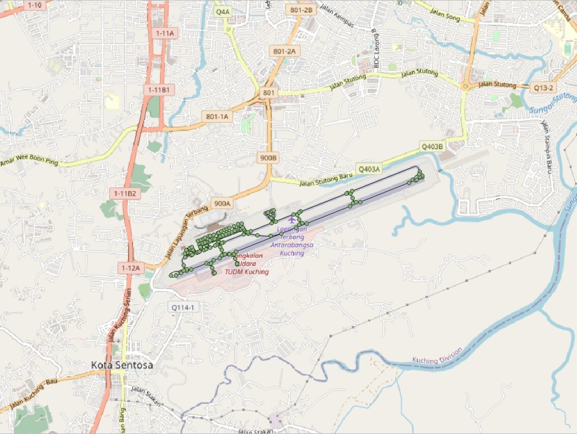 Nodes and edges of the Associated Aerodrome Surface Routing Network. This represents a subset of an aerodrome that is suitable for taxiing special-seized aircraft.